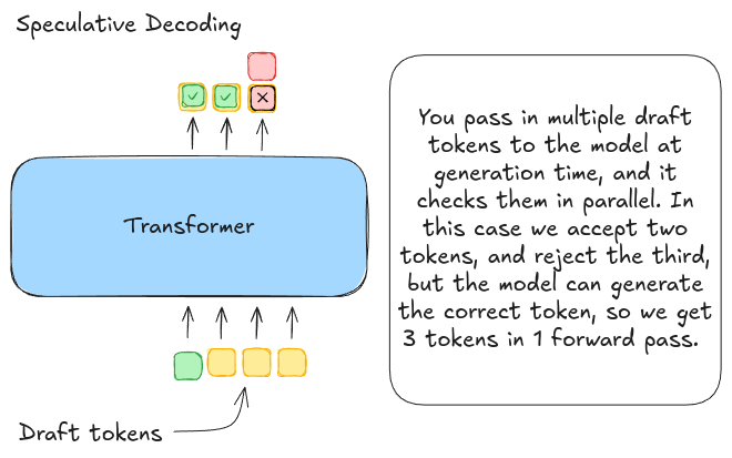 Figure 2: Speculative decoding: draft tokens are proposed, then verified by the target model in a single pass.