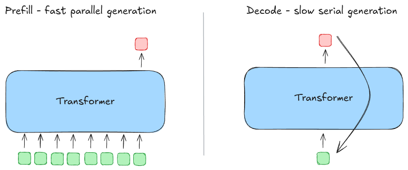 Figure 1: Prefill is a burst of parallel work; decoding is a long serial loop of many small steps.