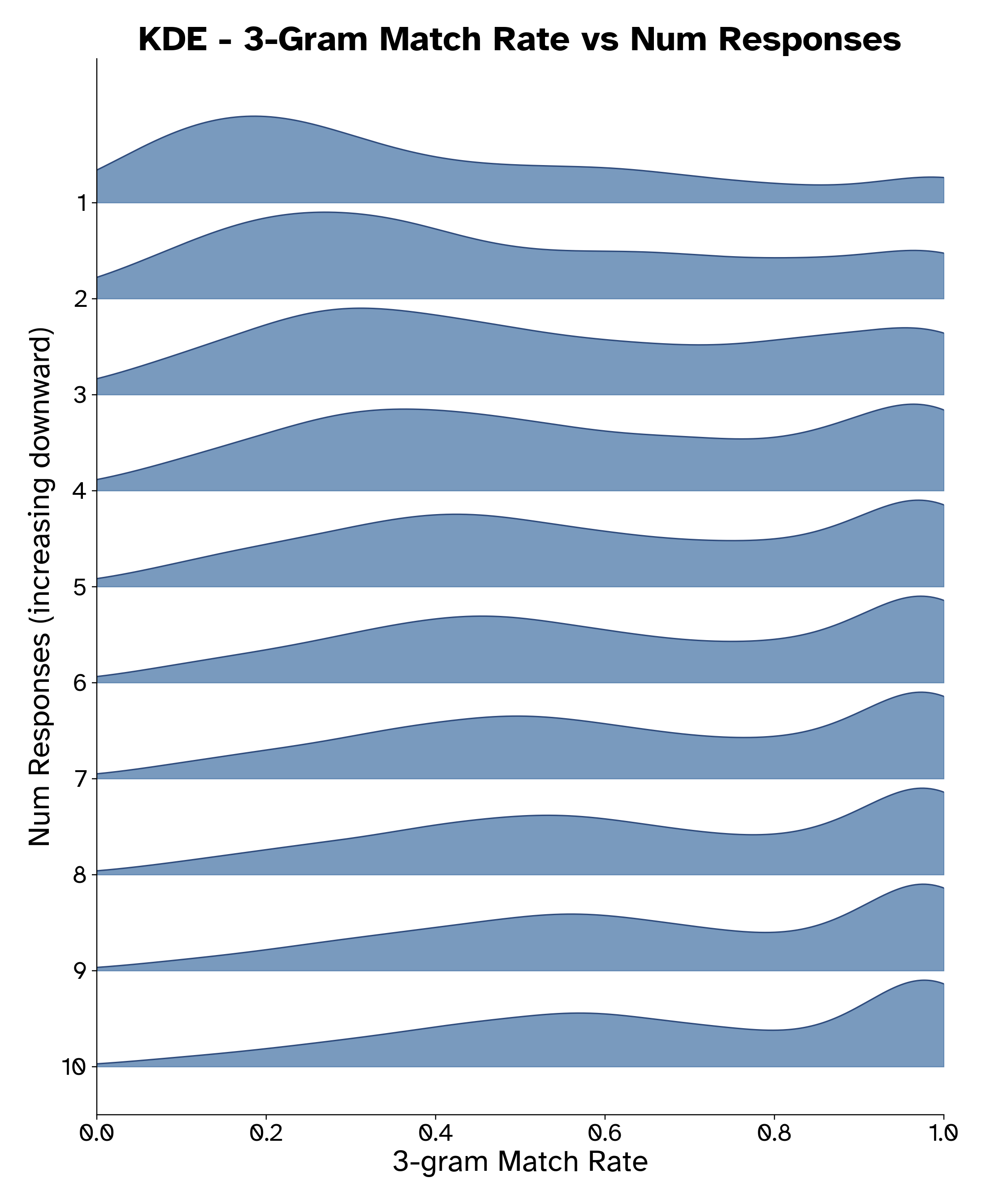 Figure 6: Distribution of match rates across examples as we increase the number of sampled responses from the draft model. As the number of sampled responses increases we see that the liklihood of n-gram matches grows significantly.