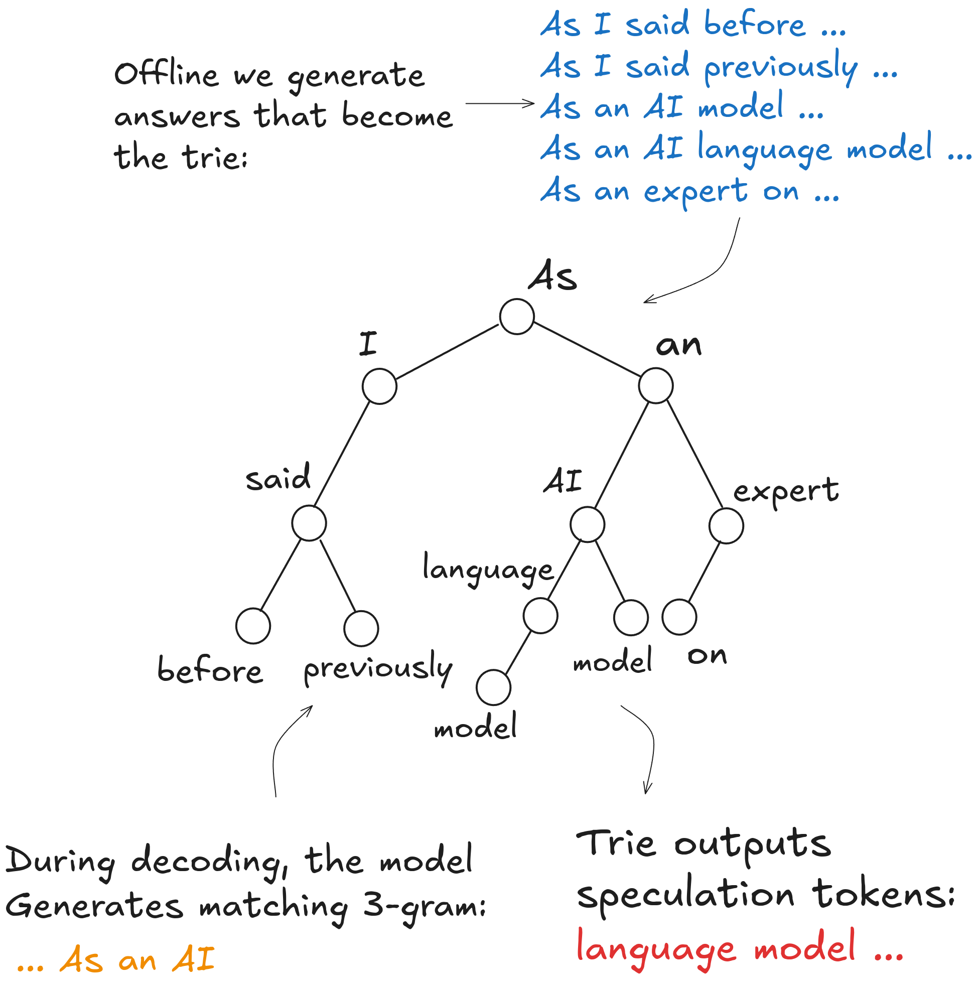 - During generation: When the model generates any tokens it is checked against the trie and if there is a match the continuations are extracted and used for speculation.
