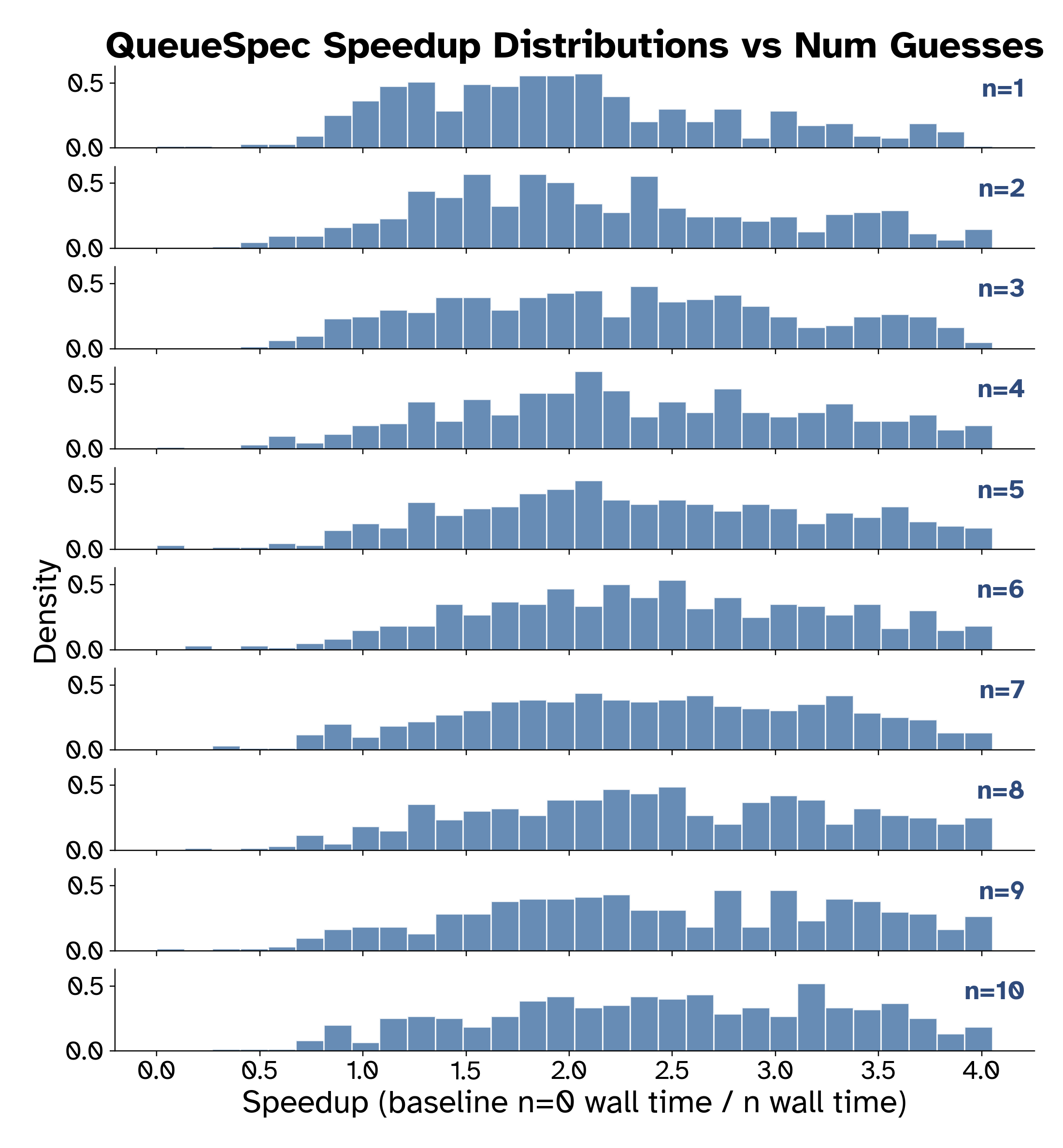 Figure 7: Distribution of measured speedups from Queue Speculating compared to the number of sampled responses on the Spec-Bench dataset. .