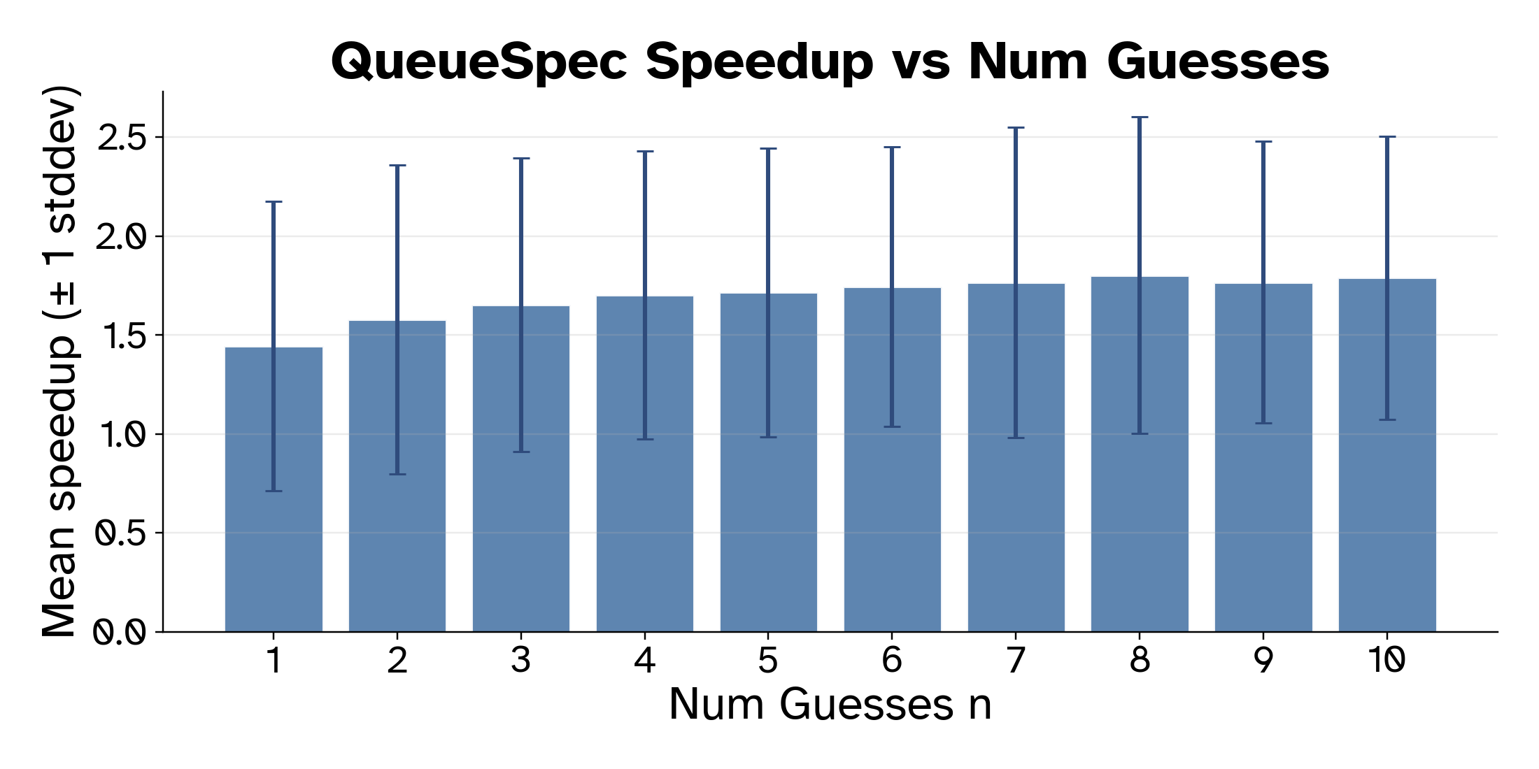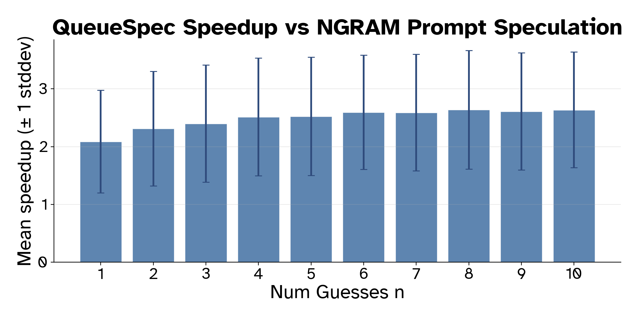 If you want to try out QueueSpec yourself you can try out our fork of SGLang. Launch SGLang as normal with --speculative-algorithm NGRAM to initialize the n-gram tree, and then to speculate off of a guess at the end of your prompt send add the following tags: ...<NGRAMGUESS>your guess here </NGRAMGUESS>. The tags and guess will be stripped from the prompt and used to speculate from.